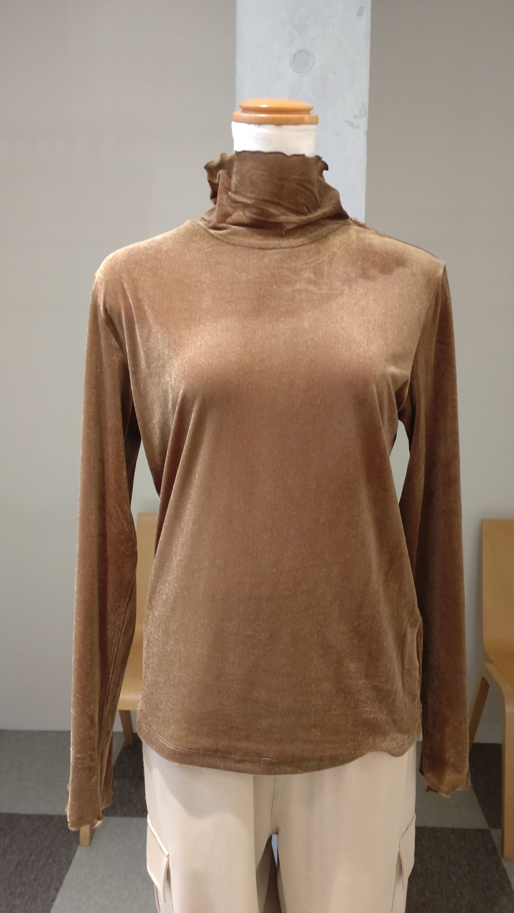 シアーベロアタートルカットソー ¥12000-(¥13200-) フリーサイズ ネックまわりと袖口はメロウ仕立て 柔らかな風合いのベロア素材 16日木曜日にホワイト、トープ、ブラウン、ブラック全4色が揃います!