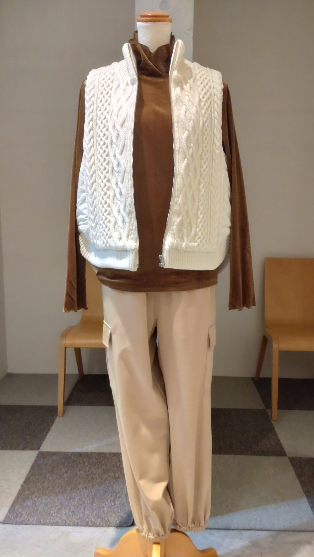 ケーブル編み&キルティングベストのコーディネート
